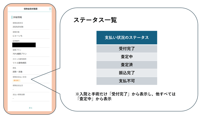 保険金の支払い状況は確認できますか? ペット保険/みらいの約束 <本内容は「わんデイズ・にゃんデイズ」「わんデイズ・にゃんデイズLight」「みらいの約束」が対象です>「わんデイズ・にゃんデイズ」「わんデイズ・にゃんデイズLight」「みらいの約束」のお客さまは、マイページの保険一覧画面の「すべての請求履歴を見る」からご確認ができます。※一部のご契約はご確認いただけない場合がございます。順次システム変更を実施しており、2025年3月以降は全てのお客さまがご確認いただけるようになる予定です。
